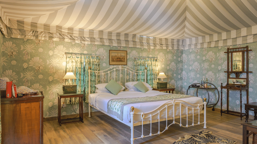A rooftop hunting tent with appropriate camp and art deco furniture used by royals on shikar outings.