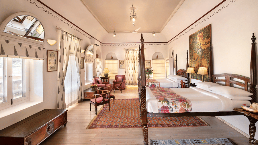 A French suite with a pillared verandah overlooking the countryside on one side and a water body on the other offers a flavor of colonial Francis from south India