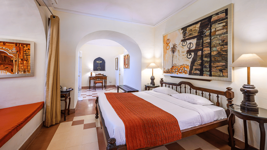 This spacious suite designed by Surya and Ritu Singh of Jaipur evokes the much-loved mango theme in Indian design – but it contemporizes it.