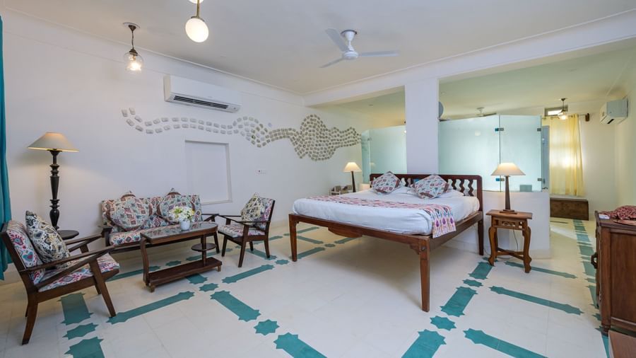 This slender white room with a glass cube double bathroom placed in the middle, is an art gallery space where the sculptural murals of Indore born Siraj Saxena adorn the walls. The painter and ceramic artist has also worked on the arches outside the room which sits at the centre of a verandah laid out with the pattern of a royal durrie. He also works in graphics, textiles, metal and wood. The windows and the balcony of this room face the sunrise. It has a double bed making it ideal for a romantic couple.